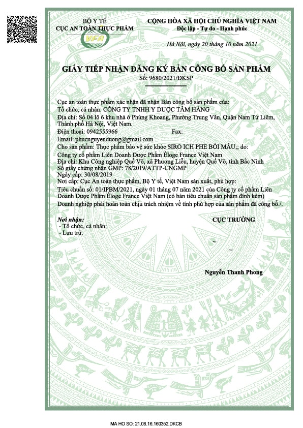 Đặc biệt sản phẩm Siro ích Phế Bối Mẫu đã được Cục quản lý Thực phẩm và Dược phẩm Hòa Kỳ (FDA) chứng nhận sản phẩm chất lượng an toàn, đạt tiêu chuẩn nhập khẩu vào Hòa Kỳ, xem tại đây.